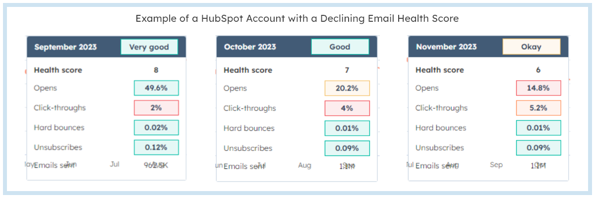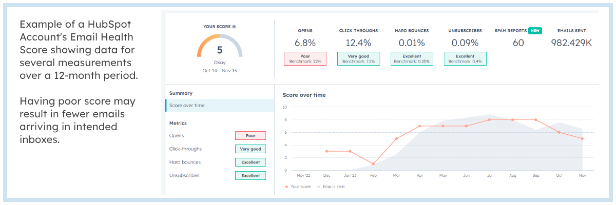 So, if your platform has a good reputation, yet you are on a blacklist, then you need to look at your email deliverability ratings and email health scores. HubSpot makes this easy for users by providing ratings and giving an overall email health score on a scale from 1 to 10. In your HubSpot account go to Marketing > Email > Health Tab to check your score.