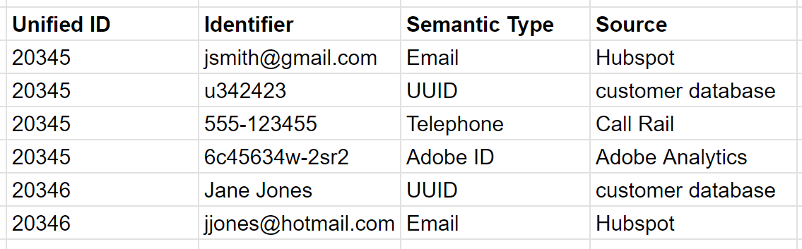 At its core an identity graph is a table with information about your customers, users or leads.Â